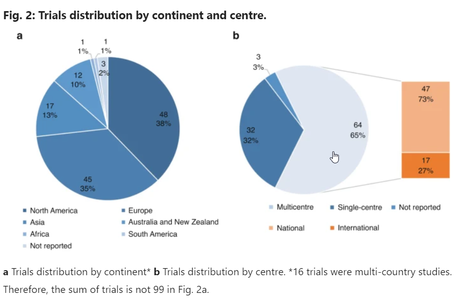 90% of the included studies were conducted in countries of very high Human Development Index (HDI), mainly in North America (38%) and Europe (35%). 65% of the studies were multicentre. Of those, 73% trials were conducted within one country and 27% enrolled participants from different countries. Distributions of the trials across continents and by centre are shown in Fig. 2a, b.